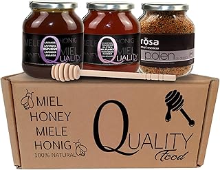 Reiner Bienenhonig 100%. Lavendelhonig (500 gr), Tausendblütenhonig (500 gr) und Bienenpollen (250 gr) Unpasteurisiert und unerwärmt. Geschenk- und Verkostungspaket. Spender aus Holz.